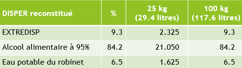 L’EXTREDISP est un concentrat de DISPER. Il a été créé pour que les grands consommateurs de DISPER puissent reconstituer facilement le DISPER sans appareillages spéciaux juste en ajoutant de l’eau et de l’alcool.